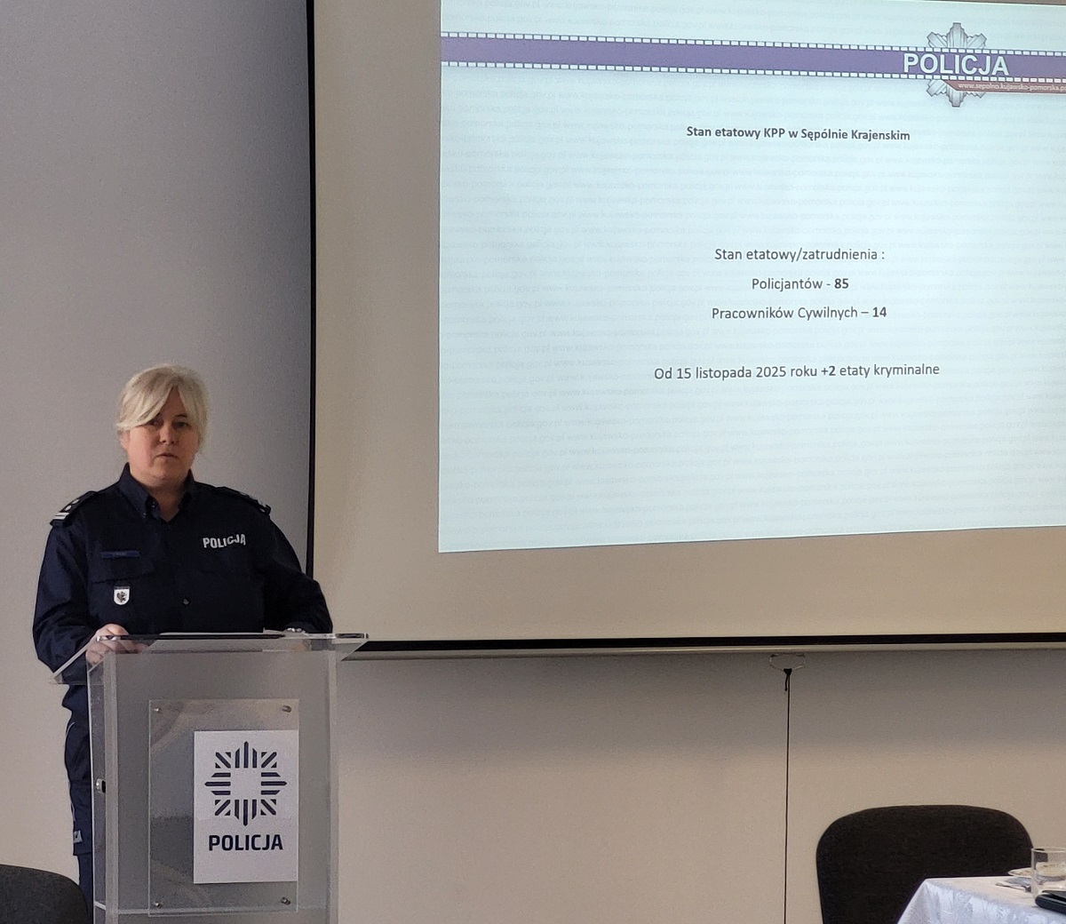Następnie głos zabrała Komendant Powiatowy Policji w Sępólnie Krajeńskim, mł. insp. dr Klaudia Ryczek, która szczegółowo omówiła efekty całorocznej pracy funkcjonariuszy za 2025 rok, przedstawiając dane dotyczące pionu kryminalnego, prewencji oraz ruchu drogowego. Podkreśliła znaczenie działań prewencyjnych i profilaktycznych realizowanych przez funkcjonariuszy oraz ich pozytywny wpływ na poziom bezpieczeństwa na terenie powiatu. Komendant zaprezentowała również osiągnięte wsparcia oraz założenia i priorytety na kolejny rok.